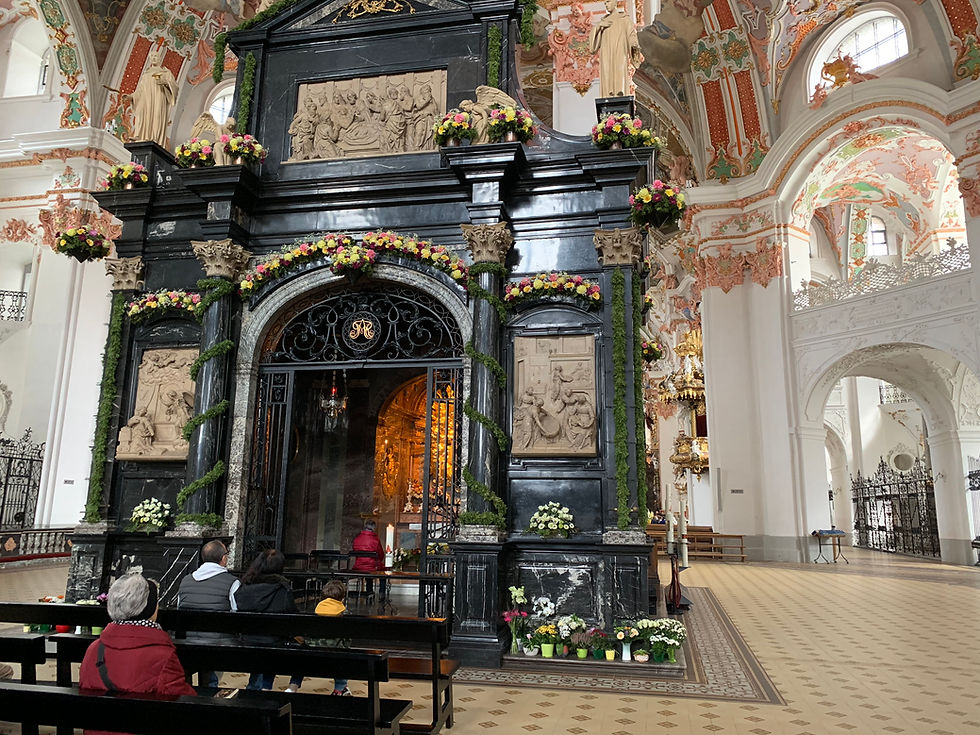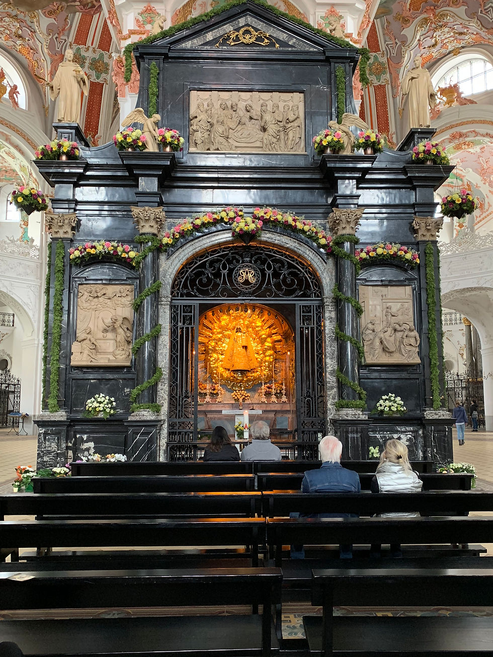 Whoever enters the church will stand in a big, octagonal room and will see right in front of her-himself the Lady of the Chapel made out of black marble. It is the prayer site of the first Meinrad of Einsiedeln. After he was murdered in 861, the “wood brothers” built a chapel over the ruins of his altar.