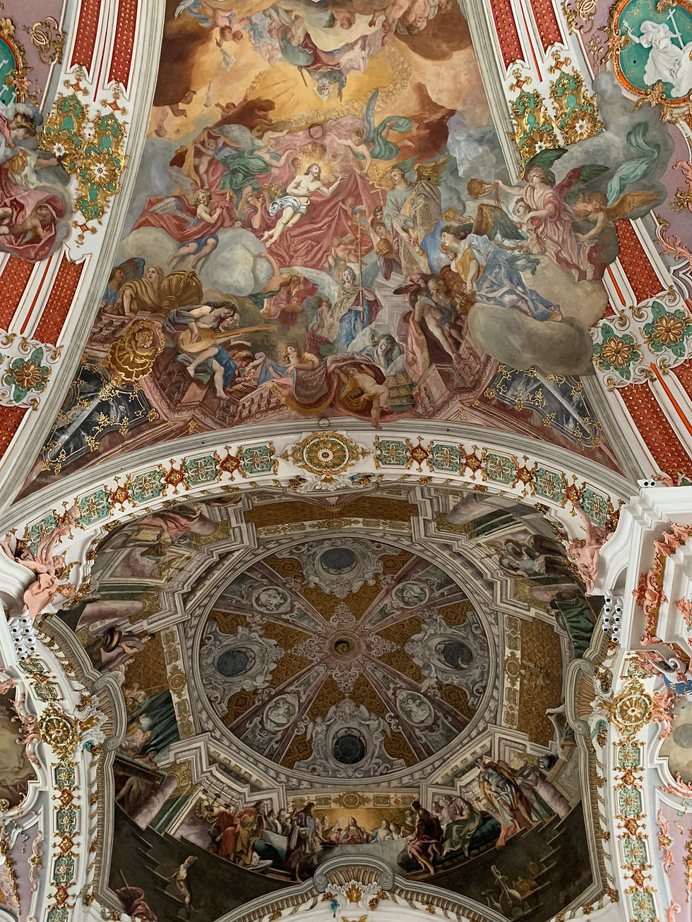 The original abbey was constructed in Romanesque and later Gothic style. Over the centuries, the abbey slowly deteriorated and required reconstruction. In 1704 reconstruction began on the abbey to include more space. The finished product is the baroque style monastery complex that still stands today. The abbey church is at the center of the complex and faces east. Here, at the very heart of the complex, the monks meet daily for church service. Surrounding the abbey church, the other wings of the abbey serve as living and working areas for the monk community and monastery school. Certain areas are also used for guests and the monastery staff. The interior stucco and murals covering the walls and ceilings of the nave were crafted by the Asam brothers of Munich. The central dome depicts an illustration of nativity story. The wrought-iron choir screen, separating the choir from the main space, is designed as visual illusion of three doors.