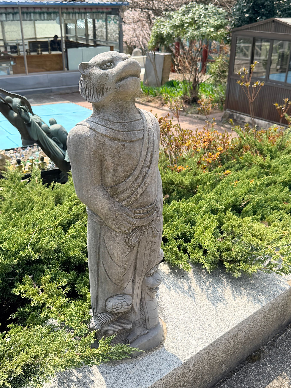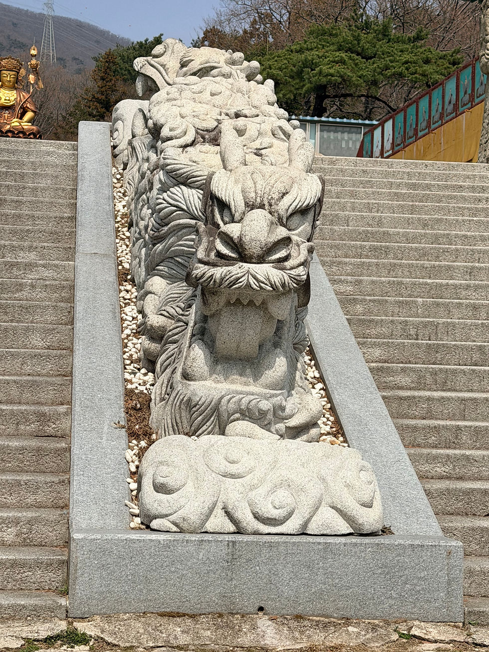 "The dazzling outdoor shrine dedicated to Jijang-bosal (The Bodhisattva of the Afterlife). This outdoor shrine dedicated to Jijang-bosal has to be one of the most impressive of its kind in all of Korea. Climbing two flights of stairs that are accompanied by two large Haetae (mythological creatures that consume fire), you’ll gain entry to this amazing outdoor shrine. In the centre of this shrine sits a large, bronze and golden statue dedicated to a seated image of Jijang-bosal. Fronting this central statue is a copper incense burner with a dragon-base that has turned green through the passage of time and the process of oxidation. This beautiful incense burner is joined by four green copper Bicheon (Flying Heavenly Deities) and a pair of copper monks. There are two entries to this outdoor shrine, which have two Geumgang-yeoksa standing over top of them. And surrounding the central statue of Jijang-bosal are countless smaller copper statues of the Bodhisattva of the Afterlife, as well as equally green copper statues of the Shiwang (The Ten Kings of the Underworld). The entire collection of copper statues are extremely impressive. And to the rear of this collection are a pair of large statues perched on top of the concrete wall backing this outdoor shrine. The white statue to the left is Gwanseeum-bosal (The Bodhisattva of Compassion), while the contemplative statue to the right is Mireuk-bul (The Future Buddha). Fronting the entire outdoor shrine dedicated to Jijang-bosal are a collection of smaller sized statues of the twelve Zodiac Generals."