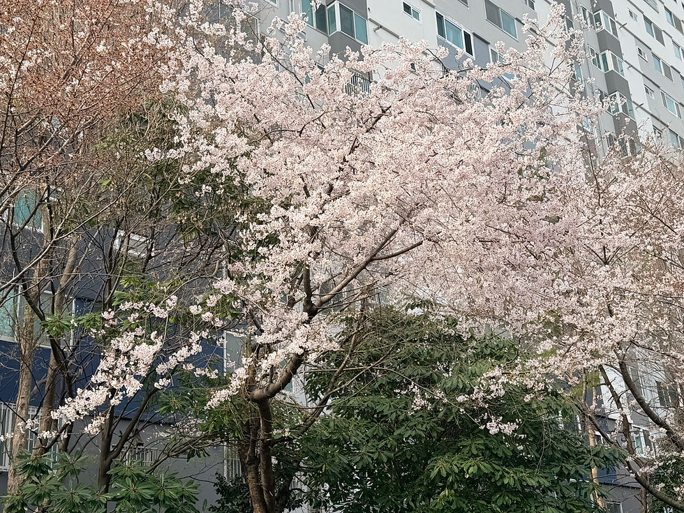 We stopped to see the cherry blossoms near the Haeundae Marina Apartments on Cherry Blossom Road. This area is famous in spring for its beautiful cherry blossoms, creating a calm and picturesque walking path.