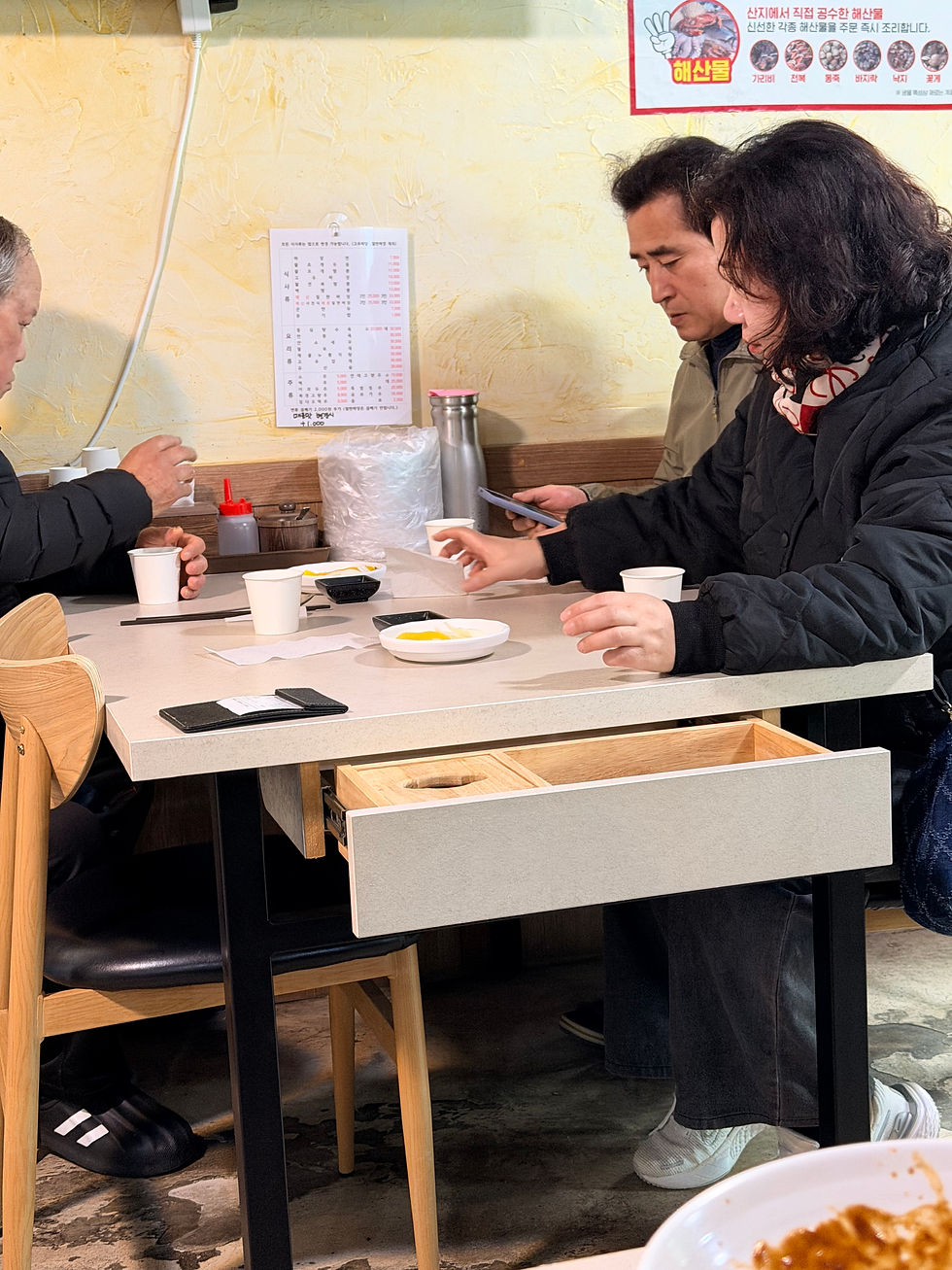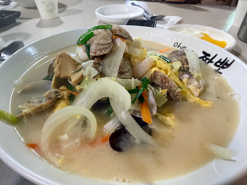 Young ordered Seafood Jjamppong: A spicy, hearty noodle soup packed with seafood and vegetables.