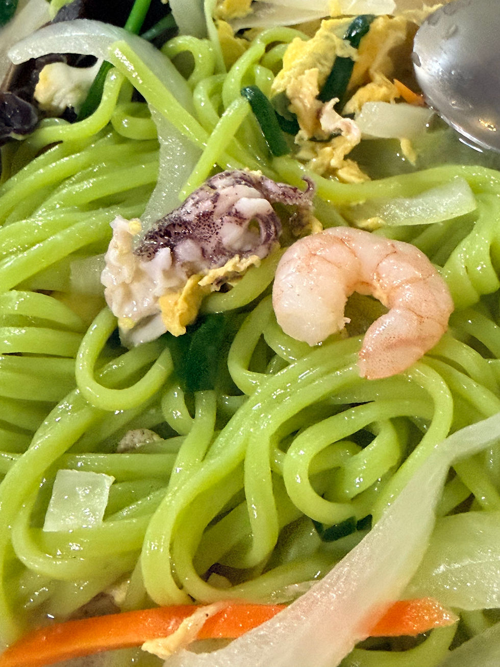 I ate Seafood Udon: Thick noodles in a light, flavorful broth with fresh seafood.. The homemade noodles were made with chives which made the noodles green. The dish had clams, shrimp, and calamari.