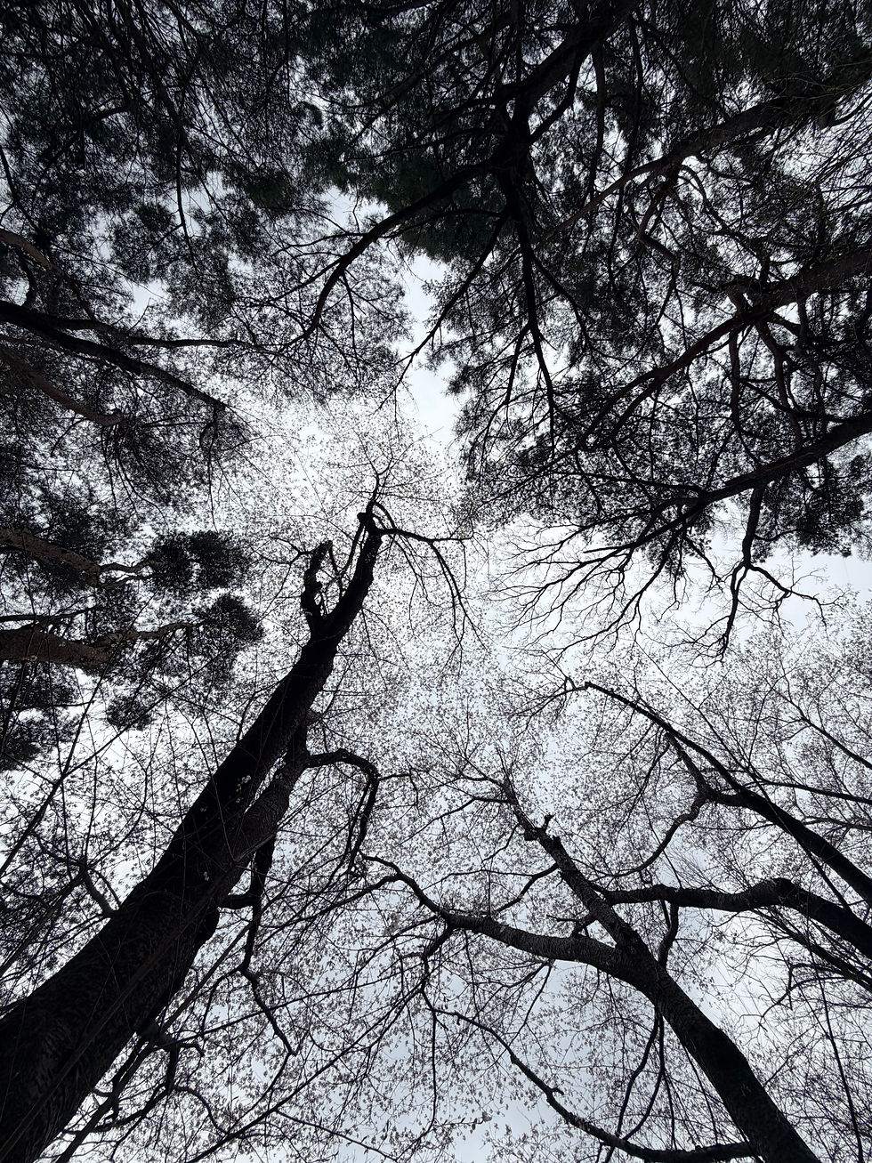 Cherry blossoms against the cloudy sky. These were not taken as black and white photos.