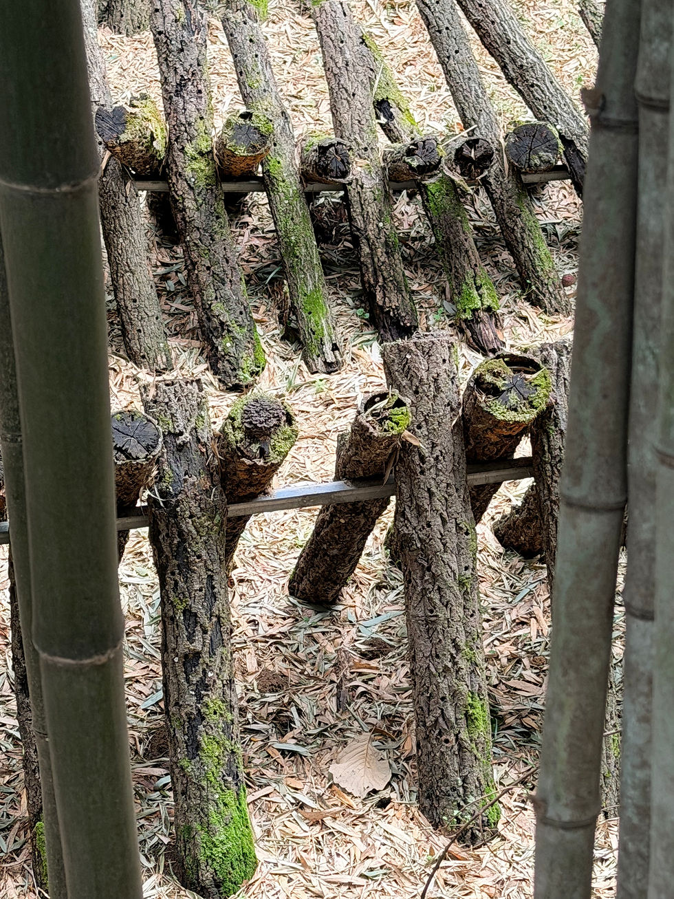 Shiitake mushrooms are growing here. Shiitake mushrooms grow on the decaying wood of trees that are most commonly found in the warm, moist areas.