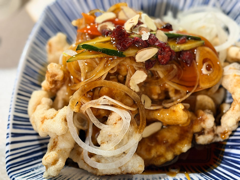 We all shared Tangsuyuk: Crispy sweet-and-sour pork, crunchy on the outside and tender inside.