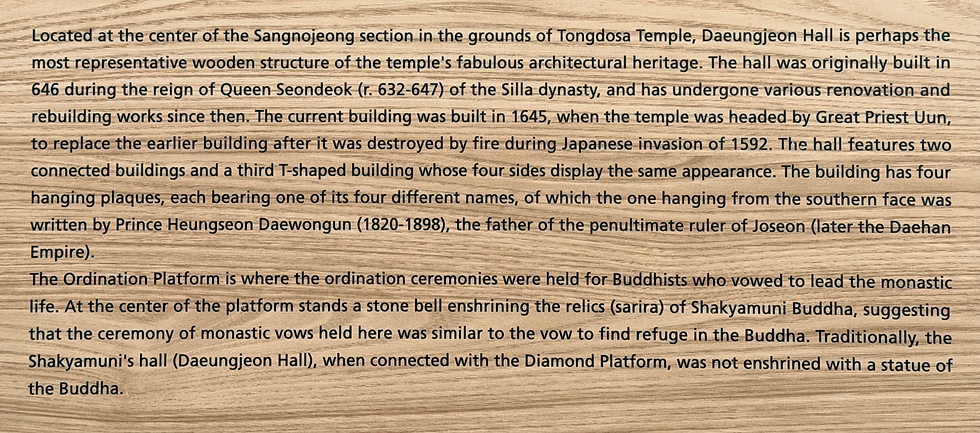 "Mt. Yeongchuk surrounding the temple resembles Mt. Grdhrakatu where the Buddha delivered the Lotus Sutra and Tongdo, the name of temple means "Pass through (to) Enlightenment." In addition, all monks have to pass through the Diamond Precept Platform (Geumganggyedan) at the temple, where ordinations take place."